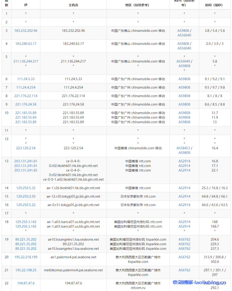 移动去程更绕了,经过日本走NTT线路到美国洛杉矶然后到意大利