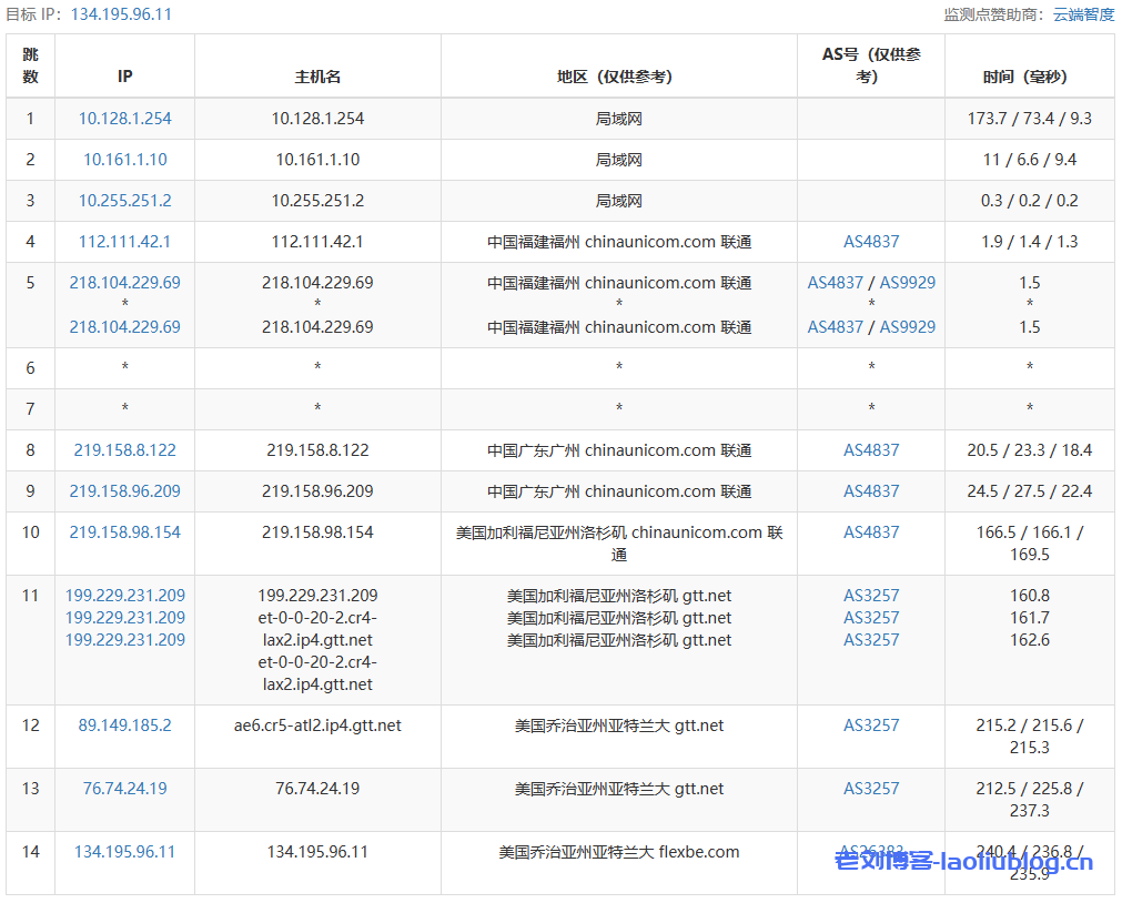 联通去程路由追踪测试结果显示去程线路不绕道,从洛杉矶入后直接到亚特兰大走GTT线路!