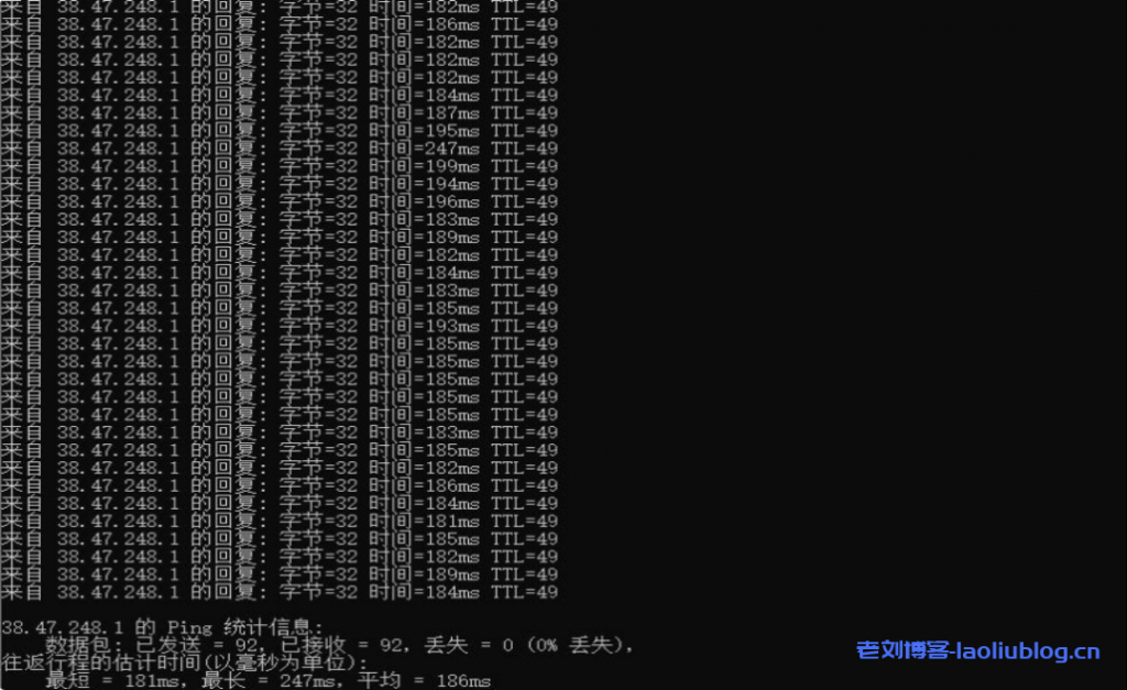 可以看到本地Ping的延迟效果在184ms左右,这个延迟对于美国机房来说算是比较低的了,而且可以看到网络非常的稳定,没有丢包的情况。