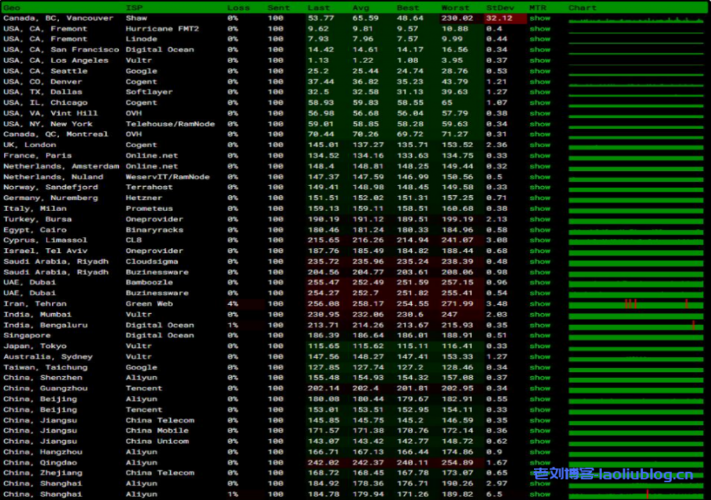 接下来我们再看看全球各节点的网络稳定性情况,如下所示: