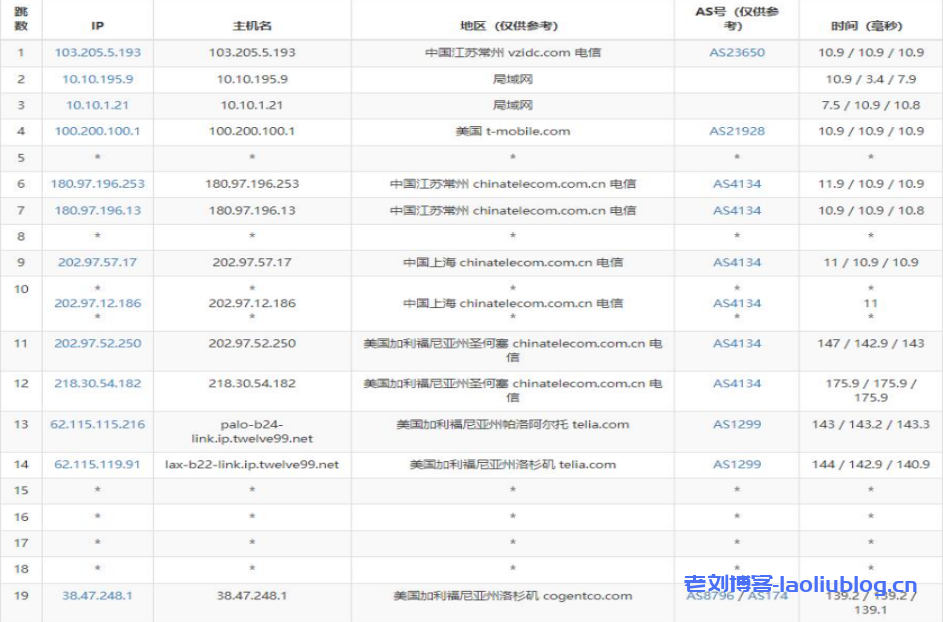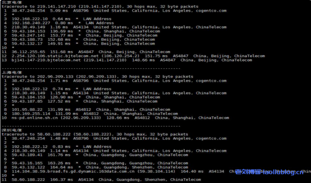 电信去程路由是从上海网口出去,经过圣何塞节点后到达洛杉矶节点。