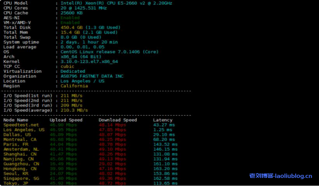 可以看到服务器采用的是E5-2660 V2.2G的10核20线程处理器(也有20核40线程可选),磁盘V/O在210MB/秒左右,可以确定使用的是SSD固态硬盘,上传和下载速度都跑满了50Mbps,相当的不错的。