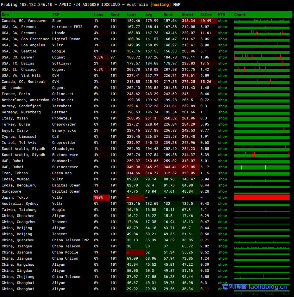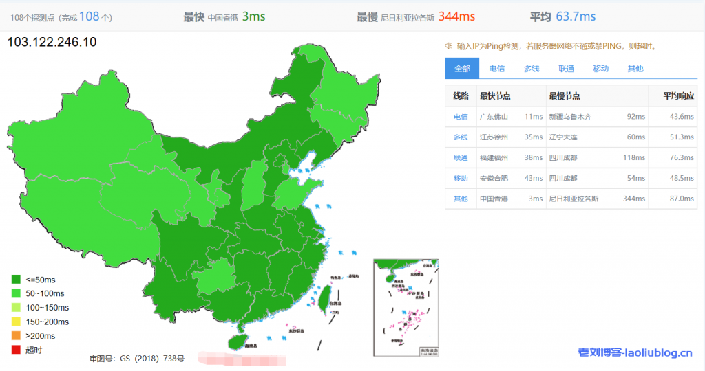 108个节点测试网络延迟情况,平均63.7ms