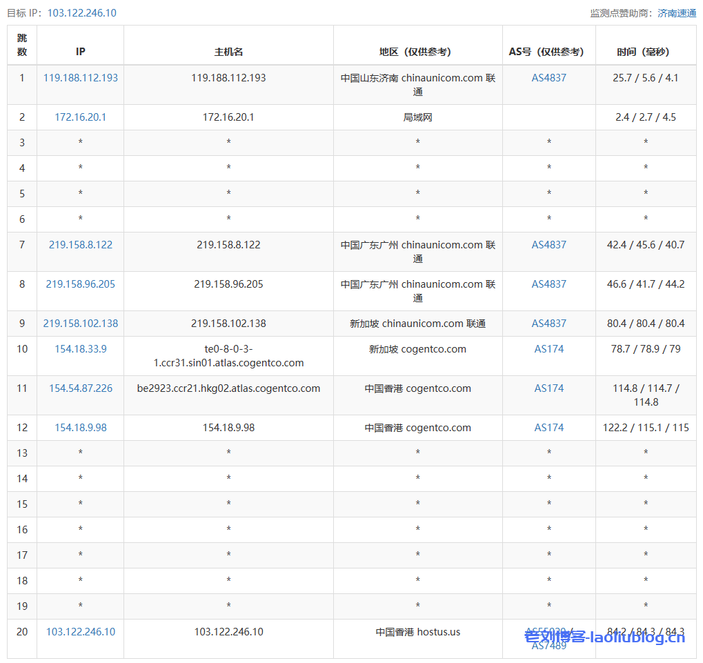 山东联通去程,转广州联通AS4837,绕新加坡congentco(AS174)再转回香港congentco(AS174)