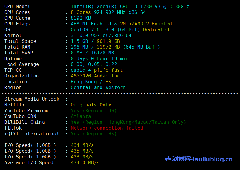 8核32内存,E3服务器;磁盘I/O读取速度评价434MB/s!