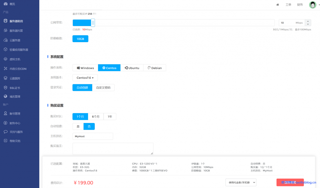目前鼎点网络香港物理机正在搞促销活动,香港E3-32G-1T SSD首月低至199元/月,次月开始299元/月。我们可以通过上图中“立即开通”按钮或者导航“数据中心”下“服务器租用”进入到机器购买界面:
