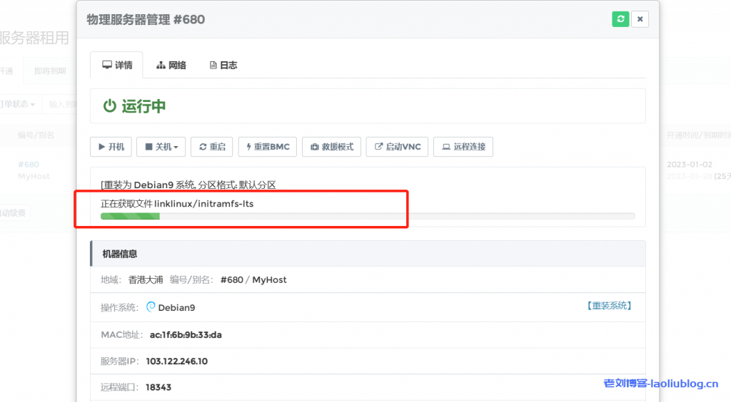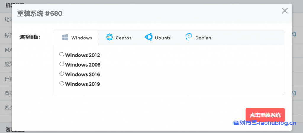 可选系统具体有:Windows 2012 Windows 2008 Windows 2016 Windows 2019;Centos7.6 Centos7.7;Ubuntu18 Ubuntu20;Debian9 Debian10。重装中,我们也能看到一目了然的进度条: