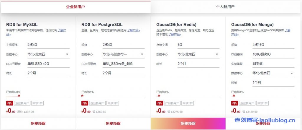 华为云个人或企业新用户,可以免费试用活动页中云数据库产品,限领1台。