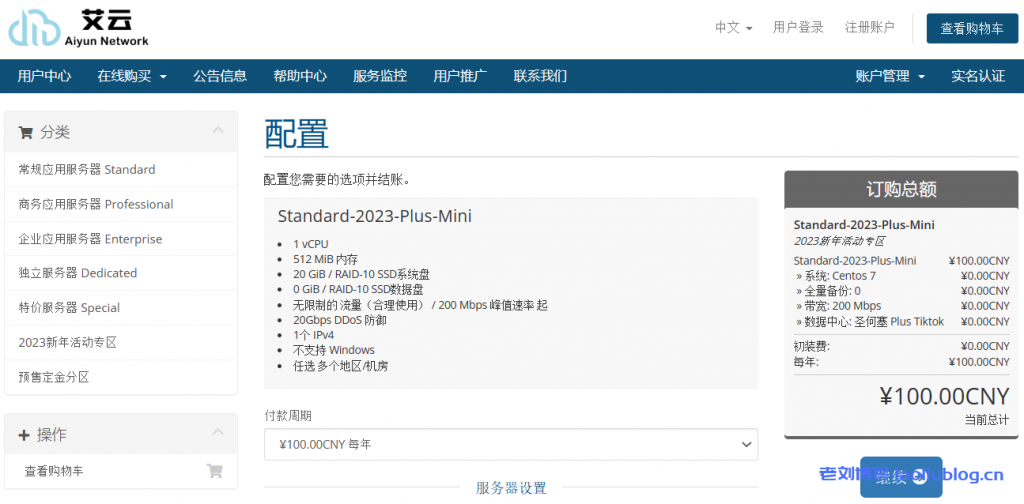 老刘有一段时间没有提及艾云VPS了,最近这家一直在处理新机房上架设置的问题,今天才得空发布了艾云春节套餐【Standard-2023-Plus-Mini】,并在其官网2023新年活动专区模块进行了上线,配置是1核512MB内存20G硬盘/200Mbps峰值带宽不限流量,免费20Gbps DDoS防御,默认1个IPv4,不支持Windows系统,机房方面可选芝加哥/西雅图/英国伦敦/圣何塞Plus Tiktok机房,价格低至100元/年!现在该套餐支持免费升级带宽,由200Mbps升级到500Mbps,有需要的可以关注下。