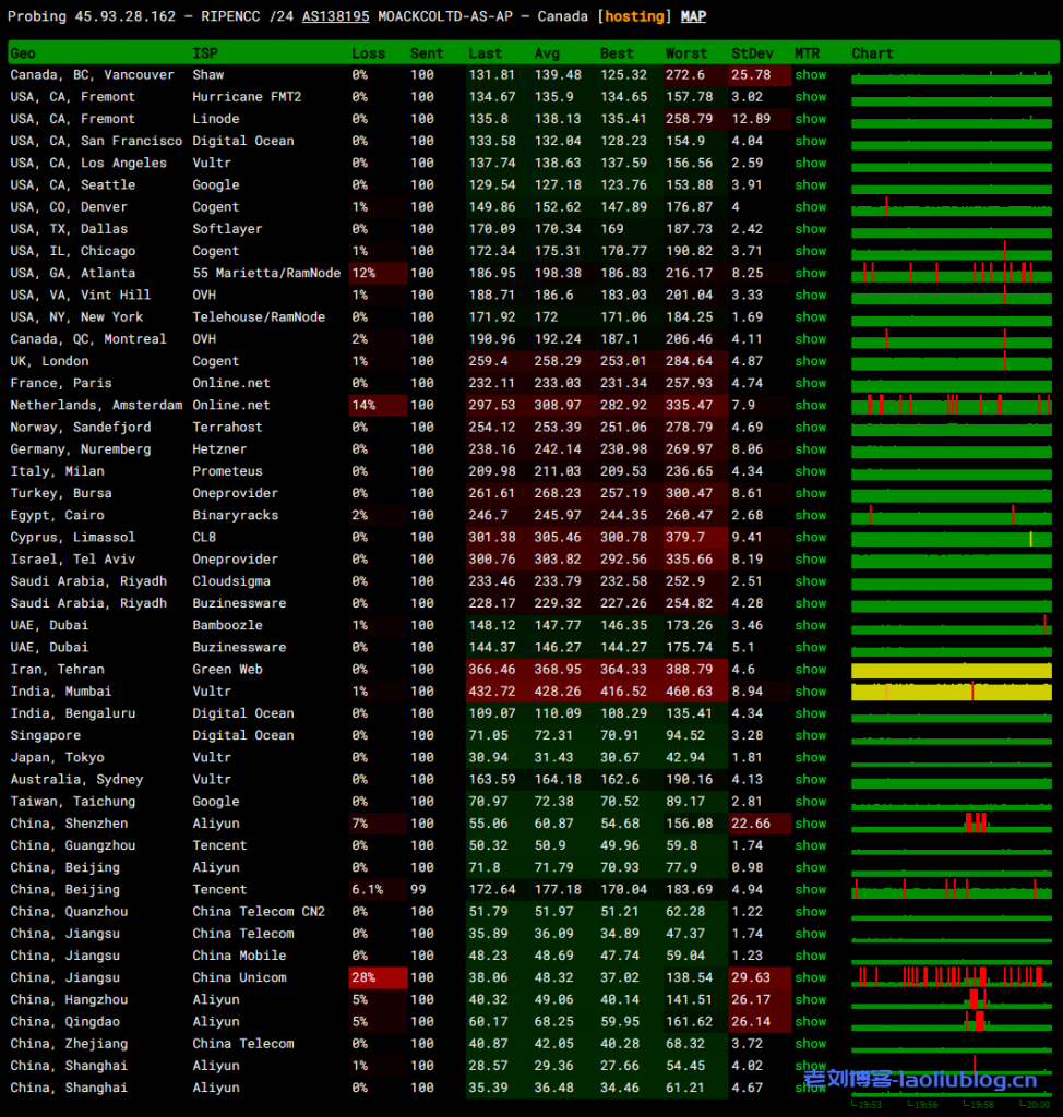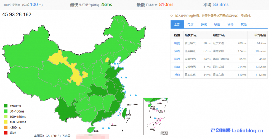 100个探测点的网络延迟情况,平均延迟83.4ms,其中来联通延迟45ms,最低。