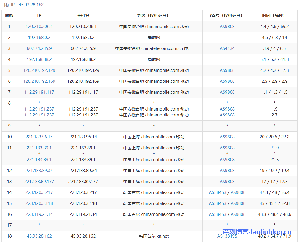 4 223.119.21.13 2.08 ms AS58453 Republic of Korea, Seoul, ChinaMobile