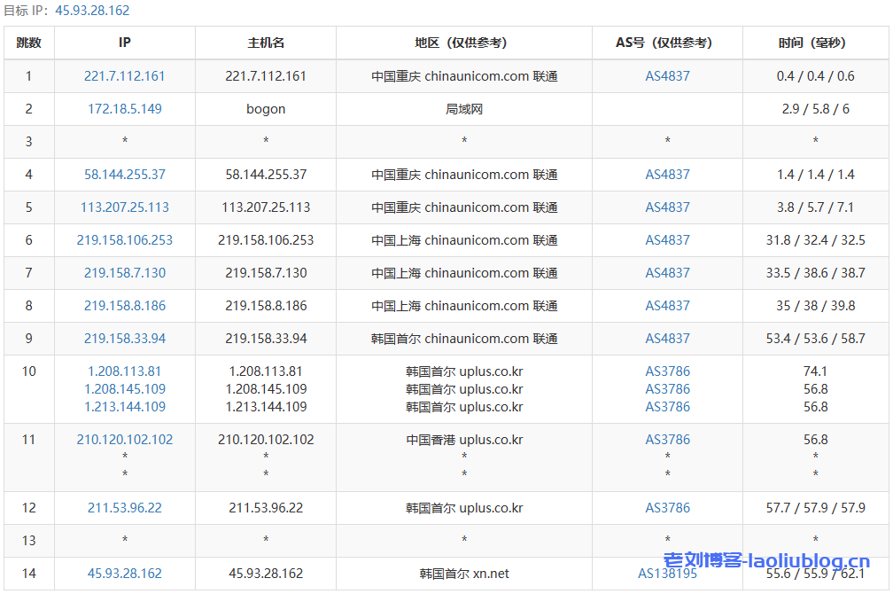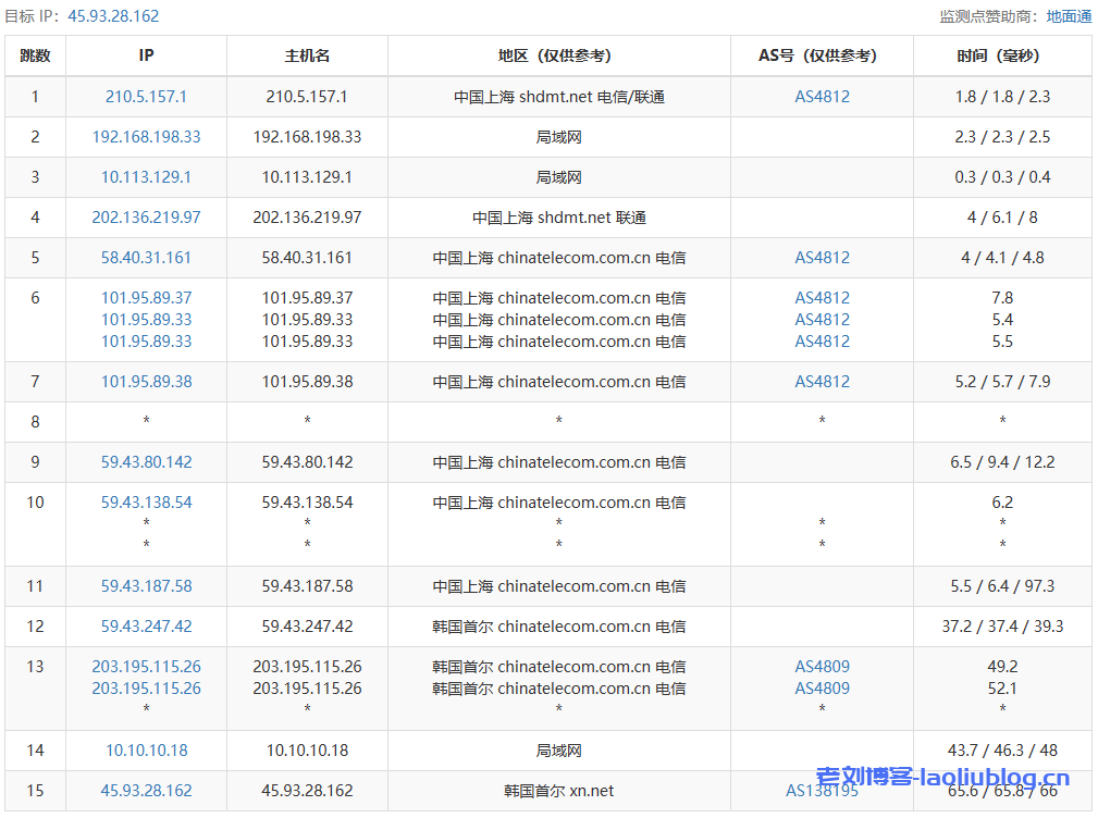 4 203.195.115.25 16.24 ms AS4809 Republic of Korea, Seoul, ChinaTelecom