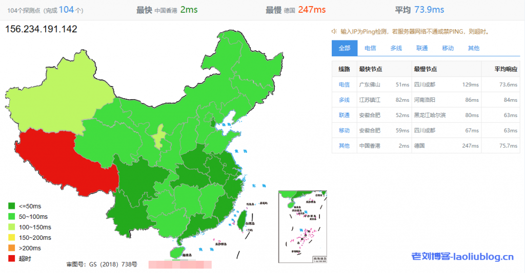 104个探测点的网络延迟情况,平均73.9ms