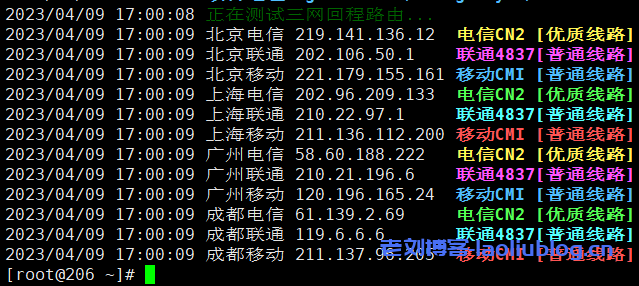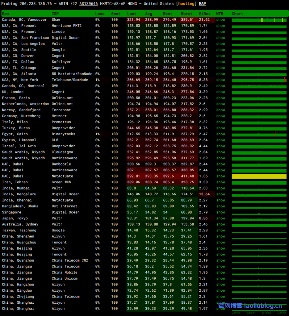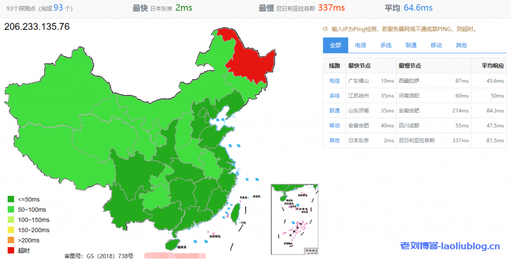 国内三网多个节点的延迟检测数据,正常水平