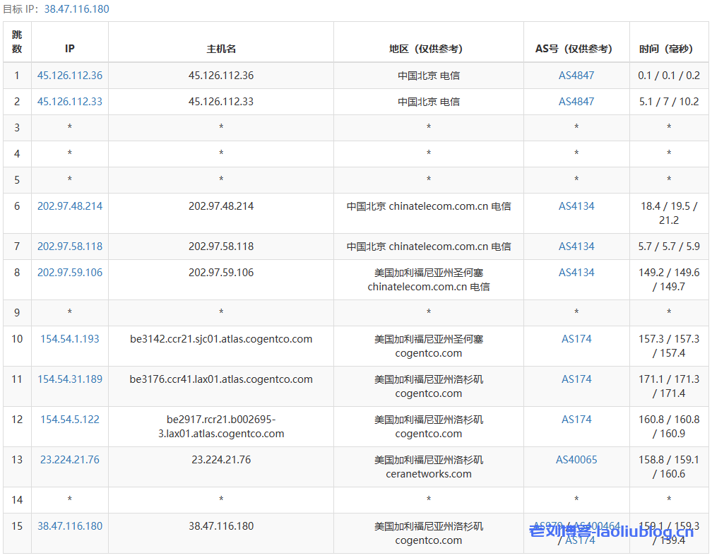 电信去程:直连电信圣何塞节点后转cogent再去洛杉矶