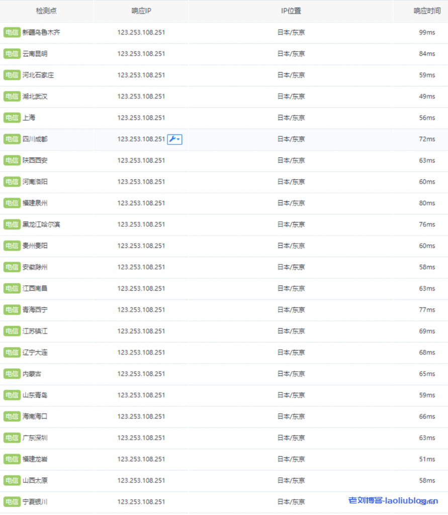 通过第三方工具测试可以看到,华南地区的深圳、广州、华北地区北京、等节点延迟都非常的低,在60ms左右,华东地区上海、浙江、青岛、江苏等节30ms~60ms。国内的速度是相当不错的。