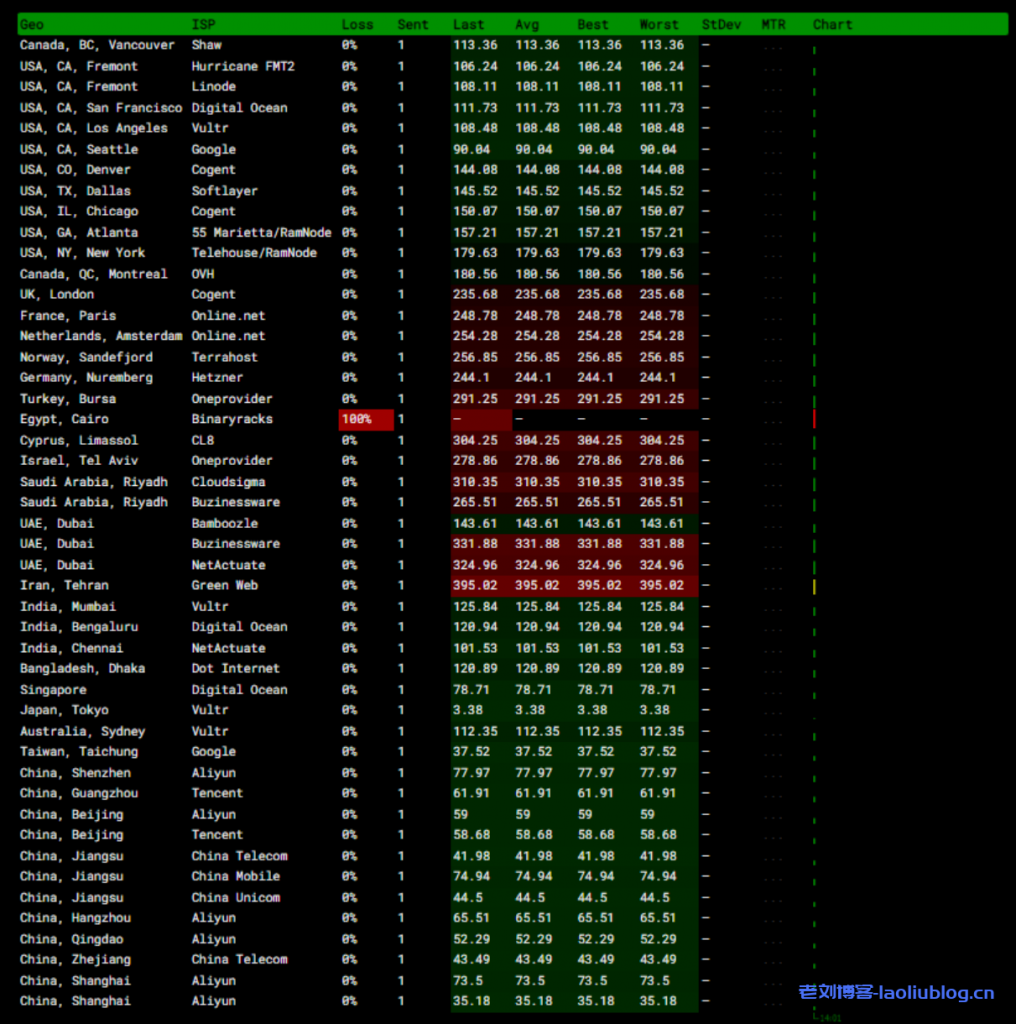 我们先来看一下海外各节点访问延迟情况,如下图所示