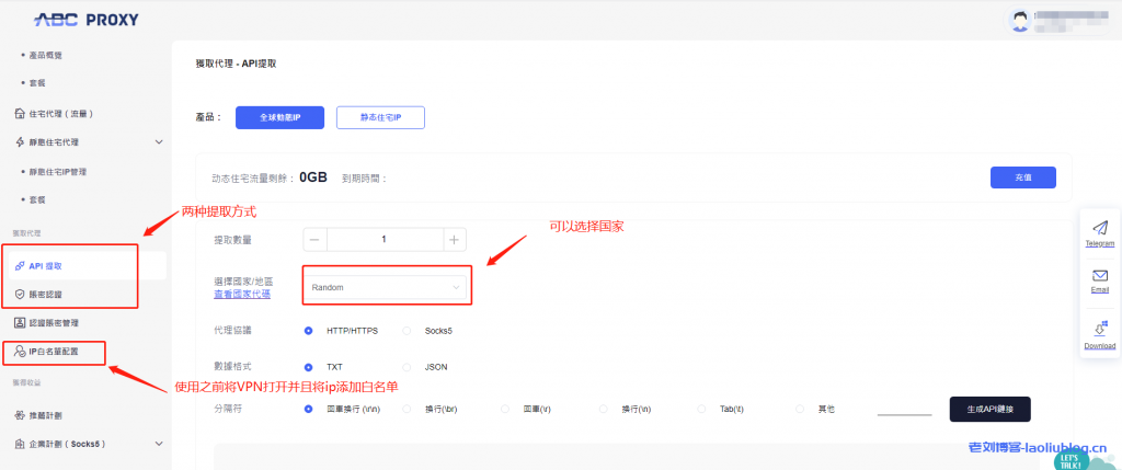ABC proxy流量套餐可以在官网的个人中心面板直接使用支持API提取和账密认证。