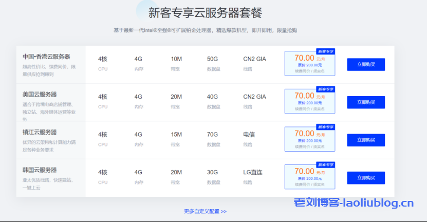 | 香港云服务器 | 4核 | 4G | 10M | 50G | CN2 GIA | Linux/Windows | 70元/月 |