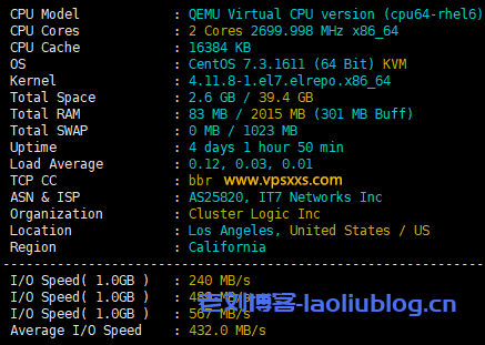 CPU双核2.70GHz,硬盘平均读写速度432MB/s;硬件整体性能还行,KVM虚拟化