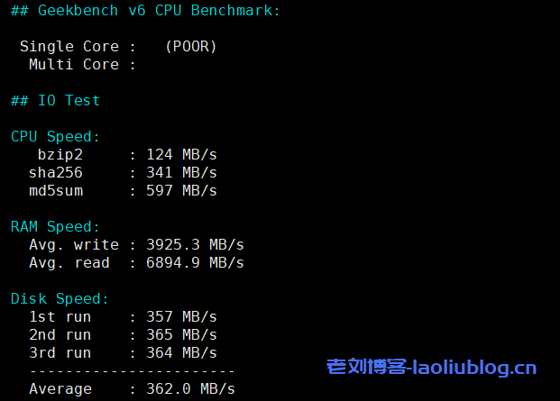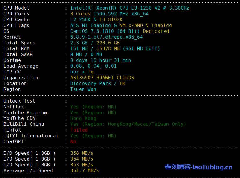 服务器用的CPU型号,站长启用了BBR,支持IPv6,野草自己的网络,归属地香港,当前硬盘I/O测试大致在360MB/s的样子: