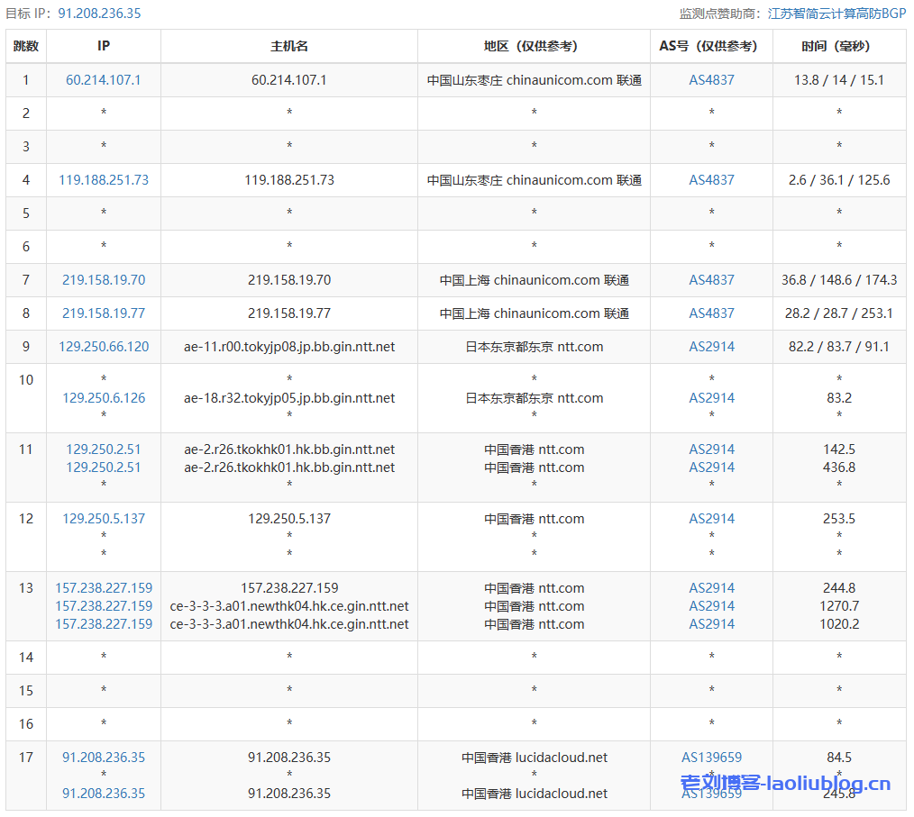 联通回程:北京/上海方向:香港NTT去日本NTT然后回国;广州方向:香港NTT转level3去美国洛杉矶然后圣何塞,从联通与level3在圣何塞的peer出来直连回国