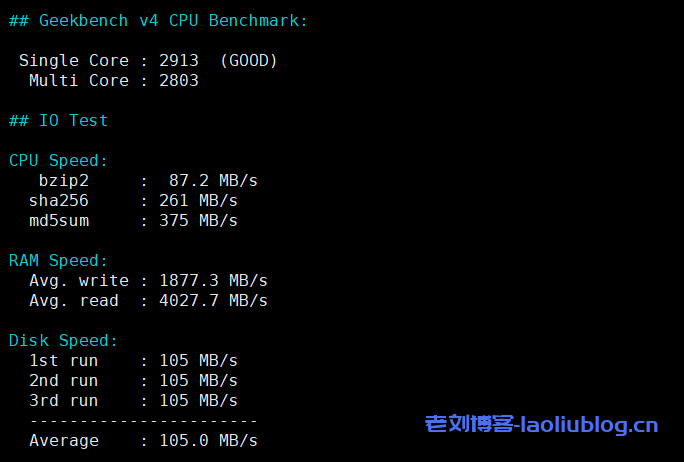 基础配置intel cpu,1核1G内存40G硬盘;流媒体解锁情况;磁盘读写速度在104MB/s的样子