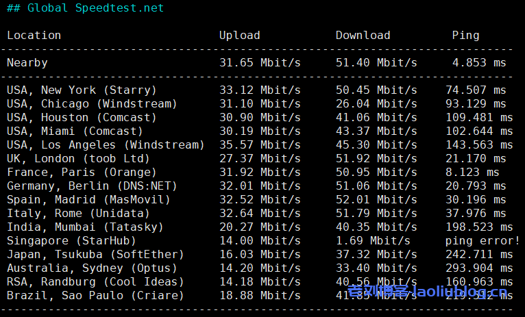 speedtest.net的部分国际节点的测试: