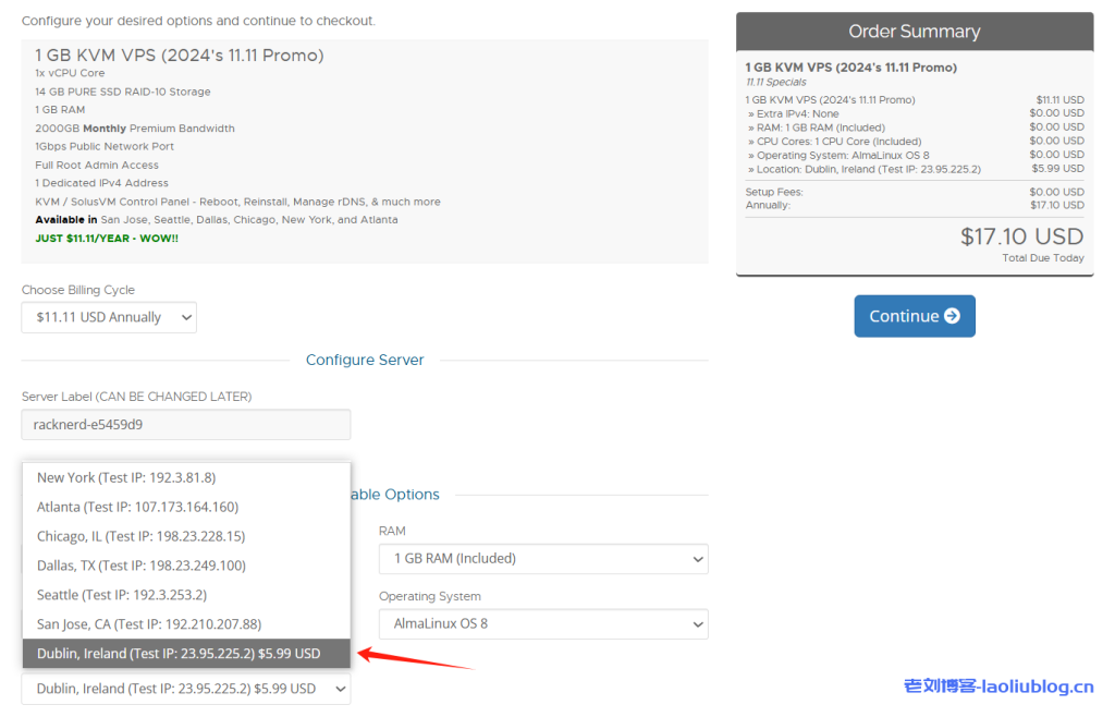 RackNerd通知其新上线爱尔兰都柏林机房VPS,目前需要加$5.99的设置费,最低配是$10.29,配置为1核/1G/20G SSD/1Gbps带宽@4T流量,这个机房套餐,商家也加到了最近的双11活动里了。想做第一个吃螃蟹的小伙伴可以试试看。