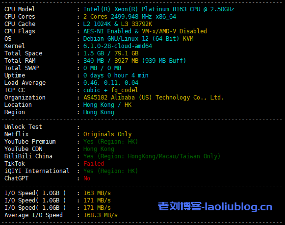 CPU采用的是Intel Xeon Platinum,主频2.5GHz,盲猜可能是8180(28核、56线程)… AS显示是阿里云,归属地香港,大致I/O 168MB/S: