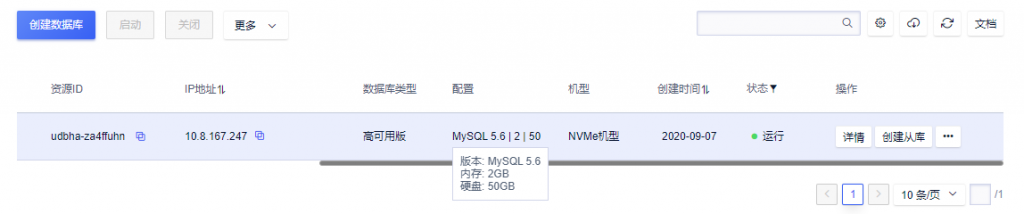 DefaultNetwork 10.8.0.0/16)的高可用版NVMe机型MySQL,详细创建流程可参阅《内网访问实现云服务器自建数据库迁移至云数据库》,这里创建完成的云数据库配置如下: