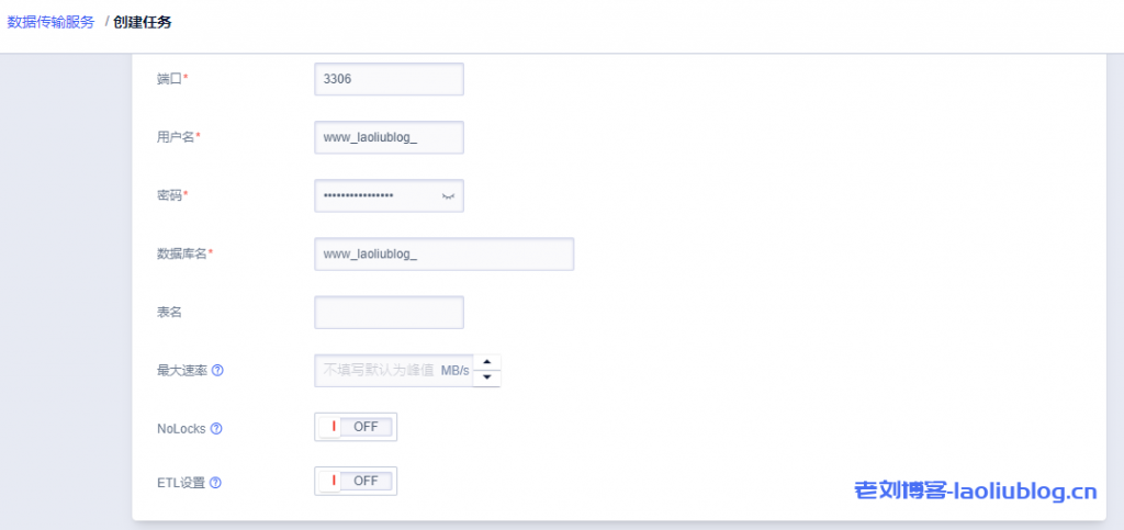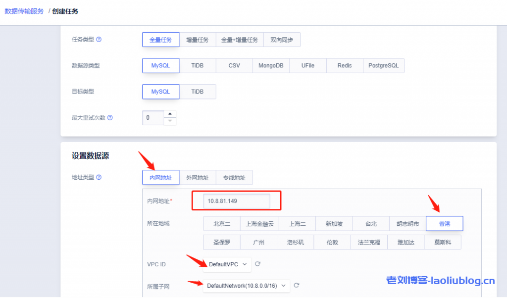 1,选择全量任务数据源(这里为快杰云主机自建)和目标(这里是UCloud云数据库)类型均选MySQL,地址类型选择内网地址,输入数据源也就是搭建老刘博客站点的快杰云主机内网IP地址10.8.81.149,选上和快杰云主机一致的可用区,VPC ID和所属子网。