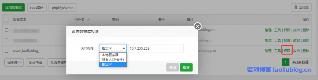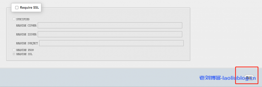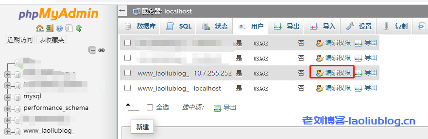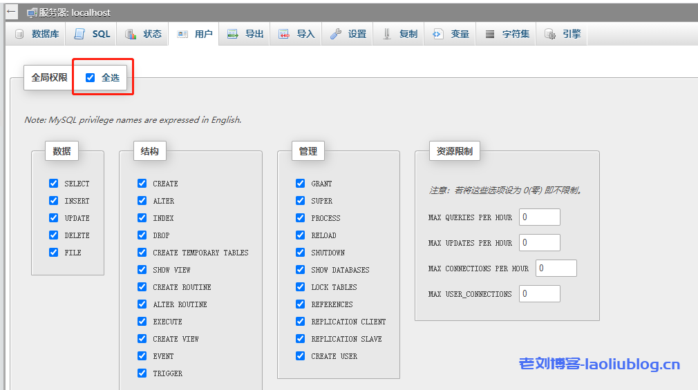 3,点选上图中phpMyAdmin按钮,进到自建数据库管理后台,修改www_laoliublog_用户权限,勾选全选数据库用户权限,然后执行,授权除了GRANT以外的所有权限。
