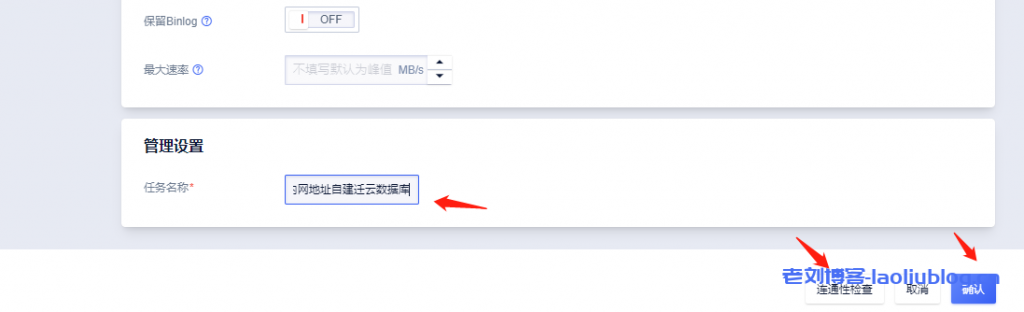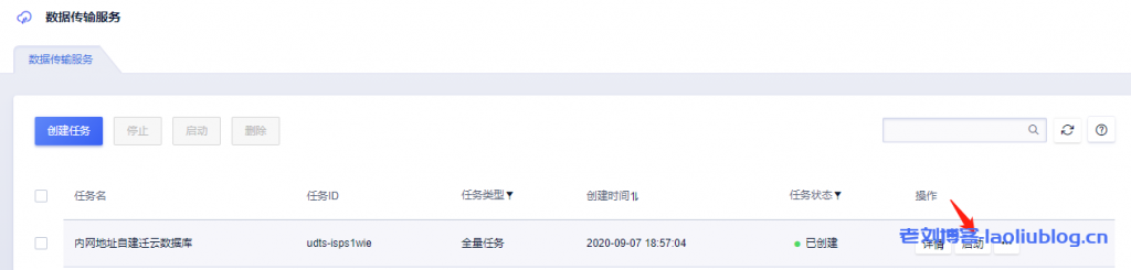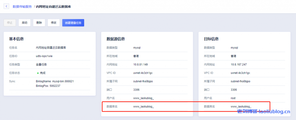 2,点选UDTS任务详情,目标信息栏,可以看到上面购买的UCloud云数据库已经创建了一个和快杰云主机自己数据库同名的数据库。这一点可以登录云数据库管理后台查看,显然www_laoliublog_数据库已完成传输。