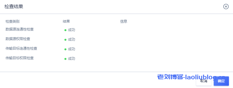 4,命名数据传输UDTS任务名,这里取名:内网地址自建迁云数据库。并进行连通性检查,这里数据源连通性,数据源权限,传输目标连通性和传输目标权限检查结果均成功。在检查结果页面点击确定,在UDTS任务创建页点击确认,完成UDTS任务的创建。即在确认创建任务前,最好要检查连通性。