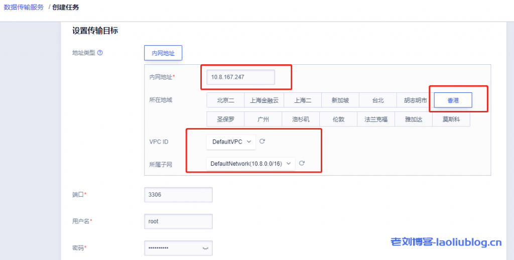 3,设置传输目标(UCloud云数据库)内网地址,所在地域及VPC网络信息(需与上述快杰云主机一致),输入云数据库端口3306,云数据库用户名即密码。