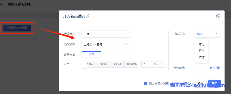 访问UCloud控制台https://console.ucloud.cn/,开通新UDPN高速通道。端点选择上海二,线路上海二—香港,或端点选择香港,线路香港—上海二,均可,只是端点打通方向不同,效果一样。计费方式为带宽计费,带宽可选2-1000MB,付费方式可按年,按月,按时支付。