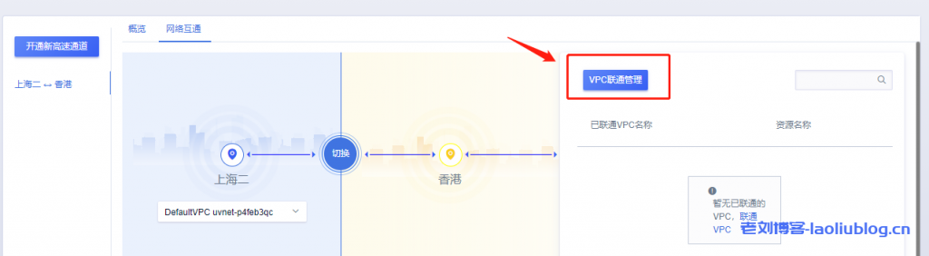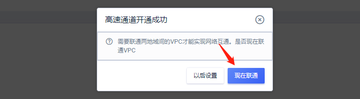 需要联通两地域间的VPC才能实现网络互通。选择现在联通VPC,打通VPC,实现内网互通。