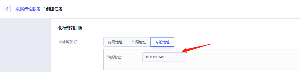 创建数据传输UDTS任务,与前文UDTS创建流程不同的是,这里需要选择专线地址,填入快杰云主机内网IP地址10.8.81.149。其他步骤和前文一致,这里不作展开,参见《使用UDTS内网访问实现快杰云主机自建数据库迁移至UCloud云数据库》。