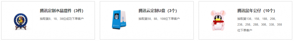 - 1)根据本活动页客户下单先后时间排序,抽取第8、18、38位成功下单客户,每位赠与1件腾讯定制水晶摆件;抽取第58、88、108位成功下单客户,每位赠与1个腾讯云定制U盘,抽取第138、158、188、208、238、258、288、308、338、358位下单客户,每位赠与1个腾讯粉色鼠年公仔。