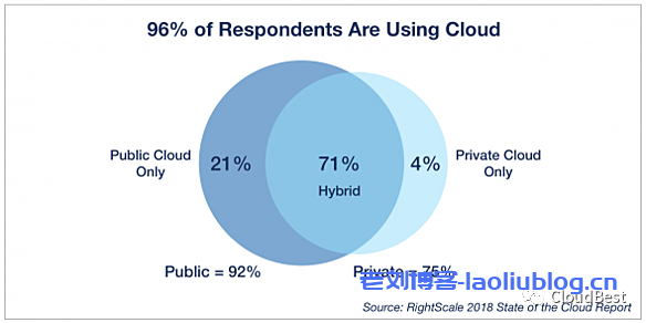 调查显示,目前采用公有云的受访者人数为92%,高于2017年的89%,而现在采用私有云的受访者人数为75%,高于2017年的72%。因此,总体比例现在使用至少一种公共云或私有云的受访者中有96%。