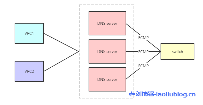 UCloud内网DNS集群,采用BGP+ECMP实现高可用及高扩展性。架构如下图: