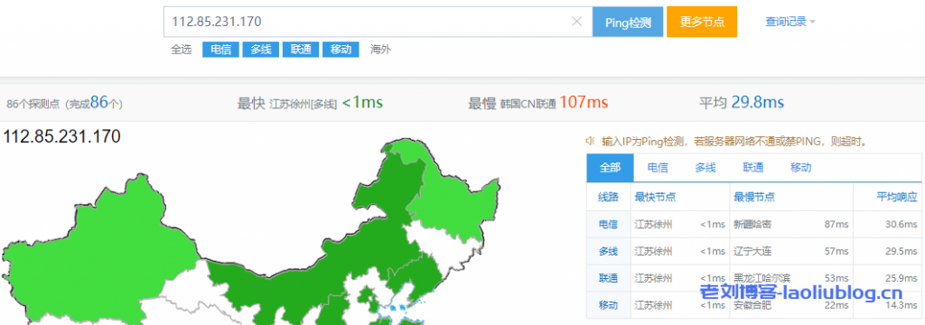 使用站长工具Ping测试了国内三网网络延时性,最快不到1ms,最慢107ms,均值29.8ms,网络延时低,性能不错。
