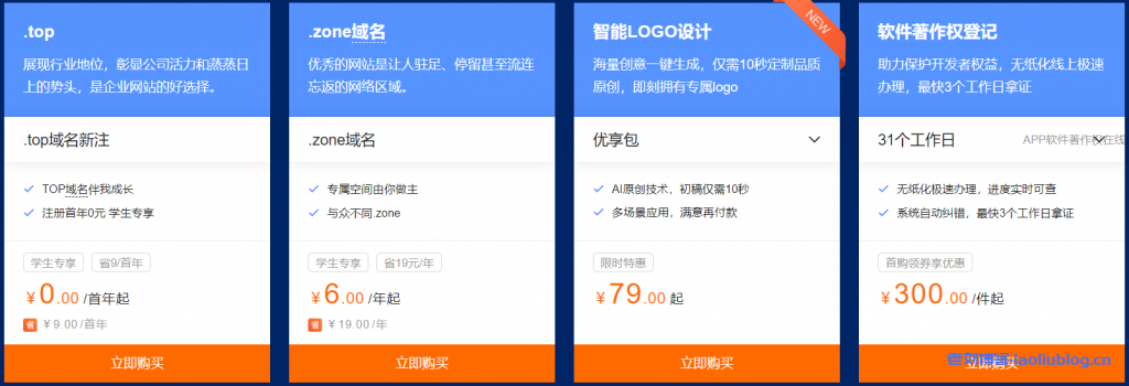 仅限学生认证用户购买,0元享受.top后缀域名,6元享受.zone域名,智能LOGO设计优享包和软件著作权登记优惠。前往购买阿里云学生0元域名优惠产品>>