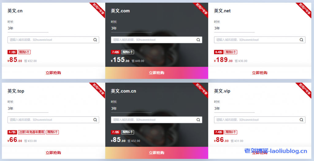 华为云服务商金秋时节推出了华为云域名金秋上云狂欢活动,.com首购23元|.cn首购8.9元|全场域名1元起购。活动区分四个专区,分别为新用户福利1元购、全民普惠低至3折,批量注册专享500元代金券和企业上云特惠推荐。老刘博客这里主要就新用户福利作下介绍,更多专区活动内容可以通过下面活动入口了解。