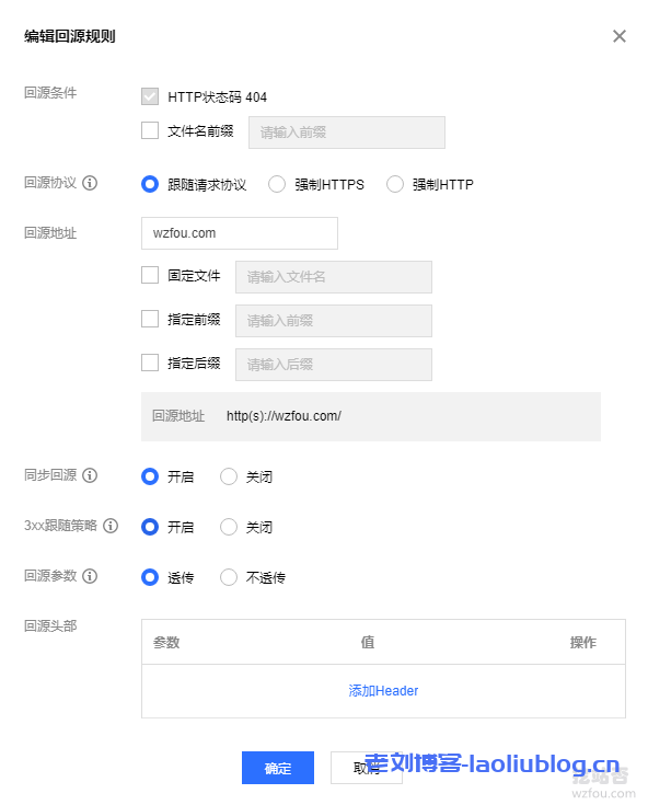 在“回源设置”中添加你的镜像回源域名,开启同步回源、3xx回源、参数回源等,以及添加你自己的Header。