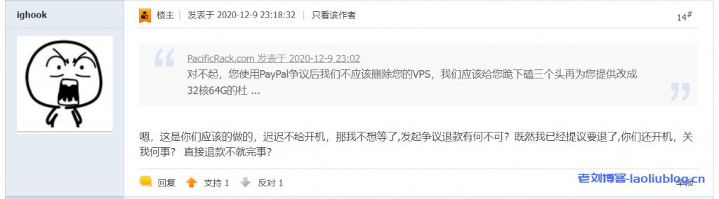 PacificRack跑路了?老刘博客留意到有网友去年年底在hostloc上吐槽PacificRack擅自删机器,不过后面PacificRack商家作了答复,大概是因为客户发起Paypal争议退款,可能存在时间差,机器先开了,之后商家又把机器删除了(文末附图)。