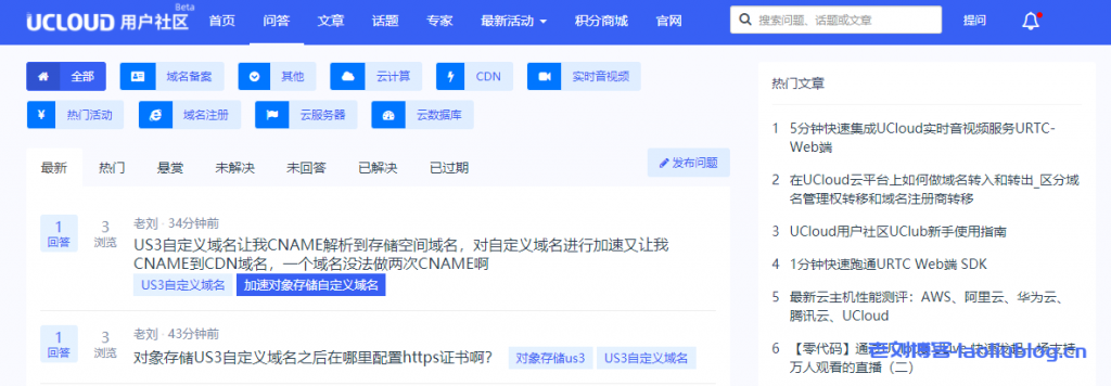问答模块:用户可以在此发布提问,交流工作学习中困扰自己的问题,或者针对不紧急的问题,在此发起提问,等待UCloud官方答复或者其他社区成员答复。前往社区>>