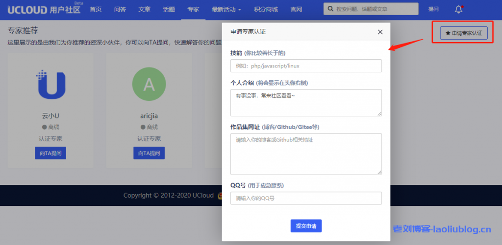 专家模块:专家模块主要是UCloud官网客服人员以及其他社区成员,长期活跃用户,生产优质内容会员,可以申请专家认证,以最显眼的方式收获他人关注,向你发私信和提问的频次更多了(这意味着更多的积分和更多的UCloud产品代金券)。前往社区>>