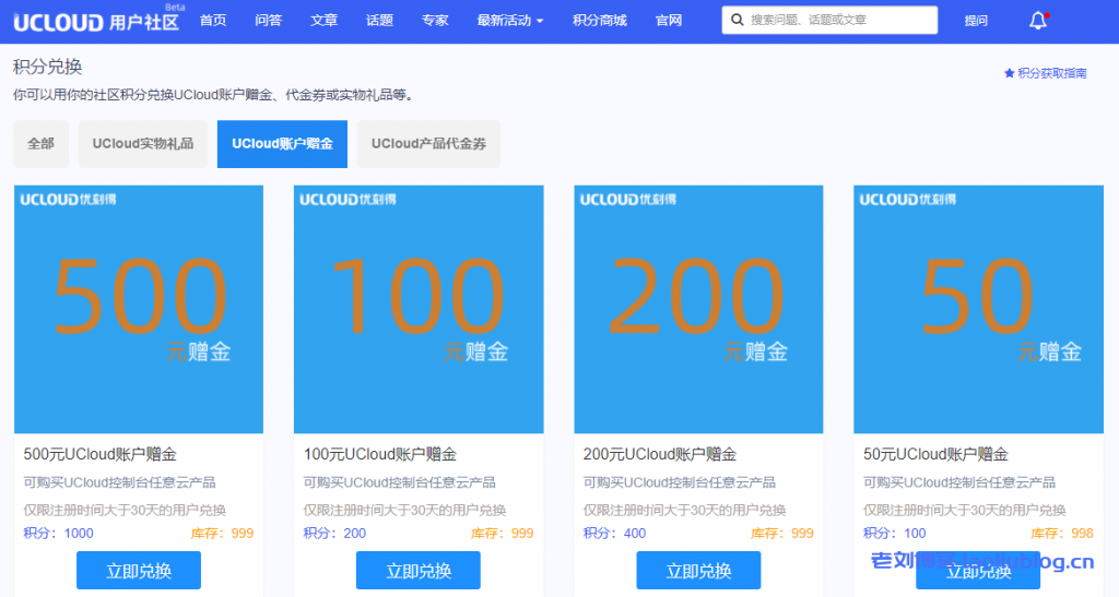 积分商城:这是老刘最喜欢的模块了,通过提问、回答问题。发布文章、评论内容、邀请好友和签到等方式获取的社区积分达到一定数值可以兑换相应的UCloud周边礼品、UClod账号赠金和UCloud产品代金券。前往社区>>